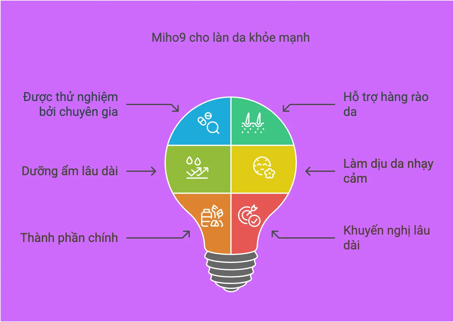 Các sản phẩm sữa rửa mặt và kem dưỡng Miho9, được thử nghiệm bởi bác sĩ da liễu và dược sĩ, giúp củng cố hàng rào bảo vệ da, dưỡng ẩm và làm dịu da nhạy cảm. Với các thành phần như pro-vitamin B5, nha đam và dầu dưỡng, Miho9 cung cấp độ ẩm lâu dài và bảo vệ da hiệu quả.